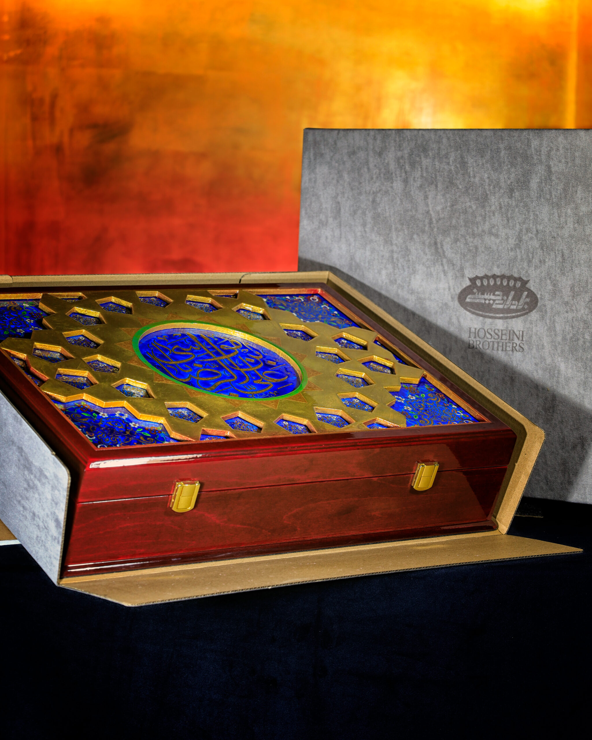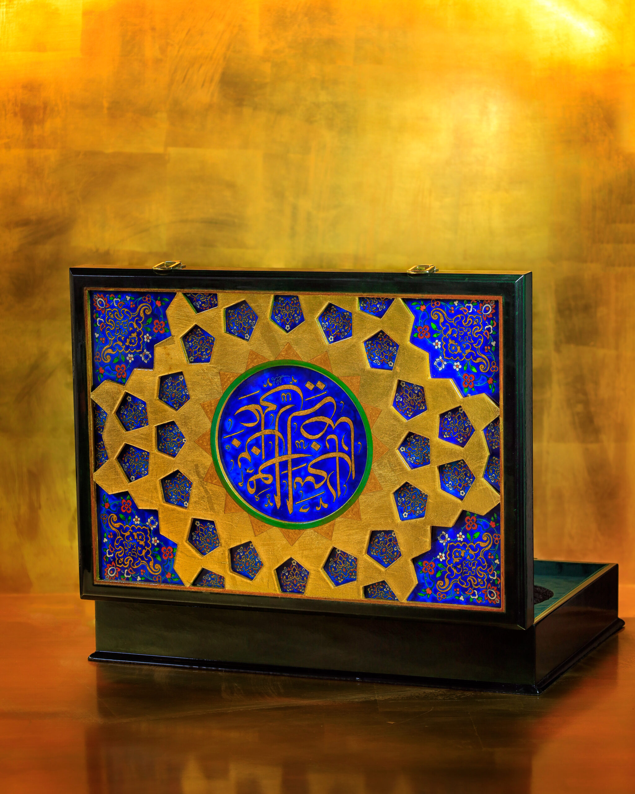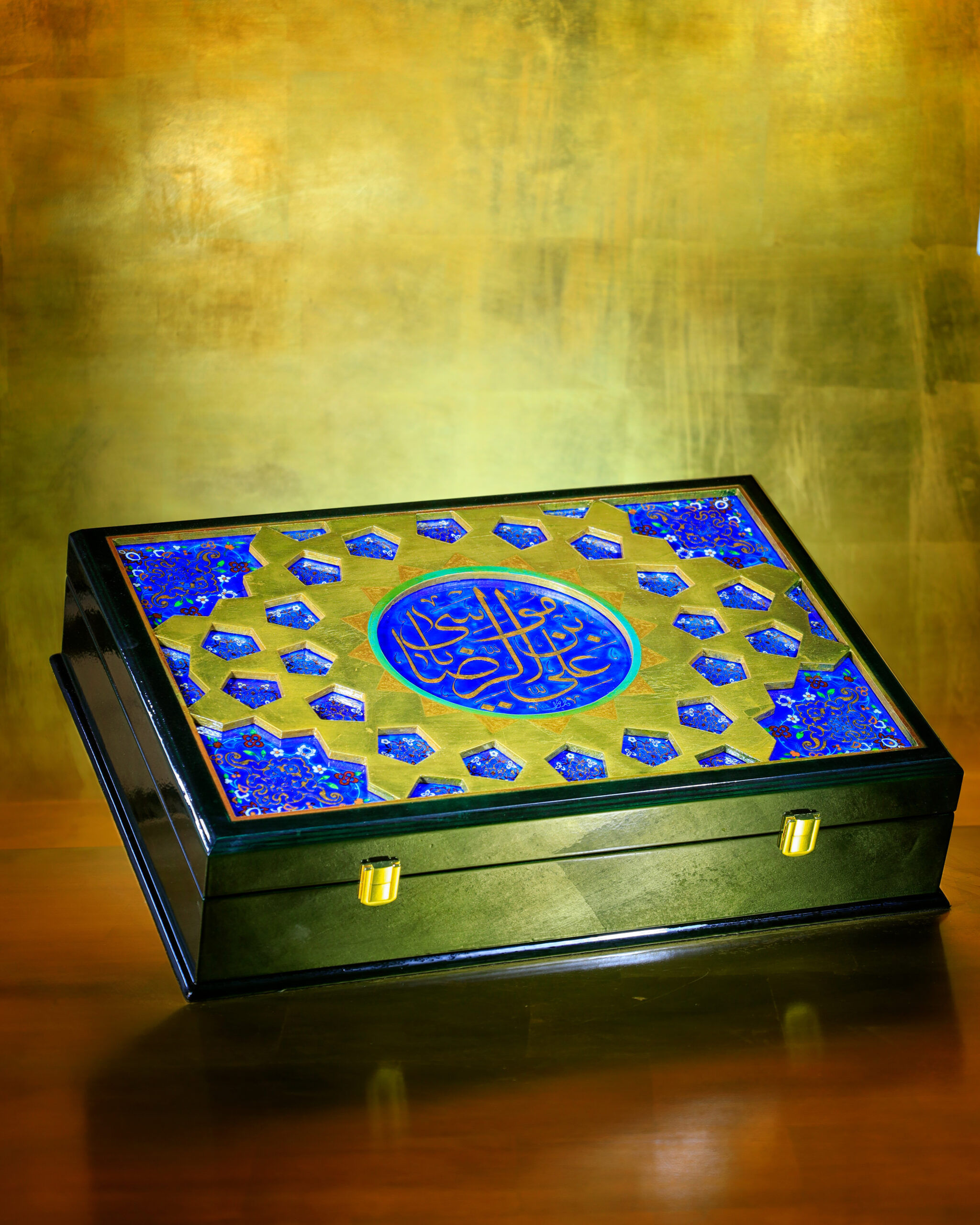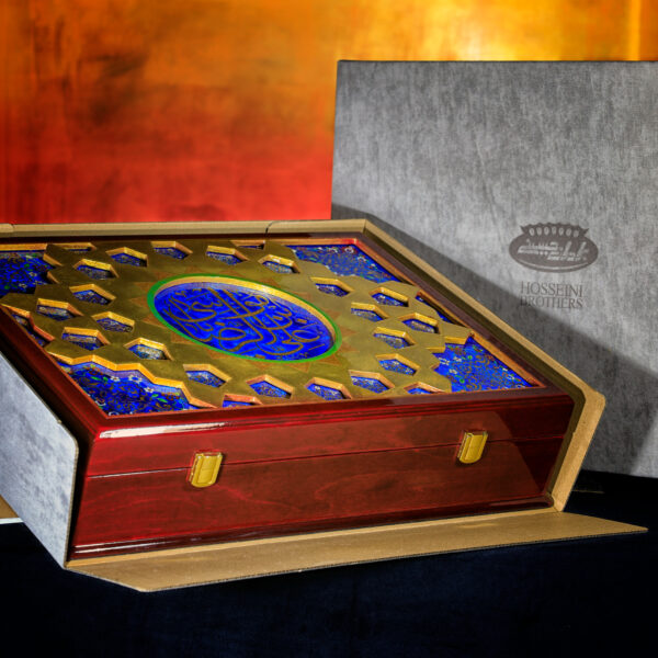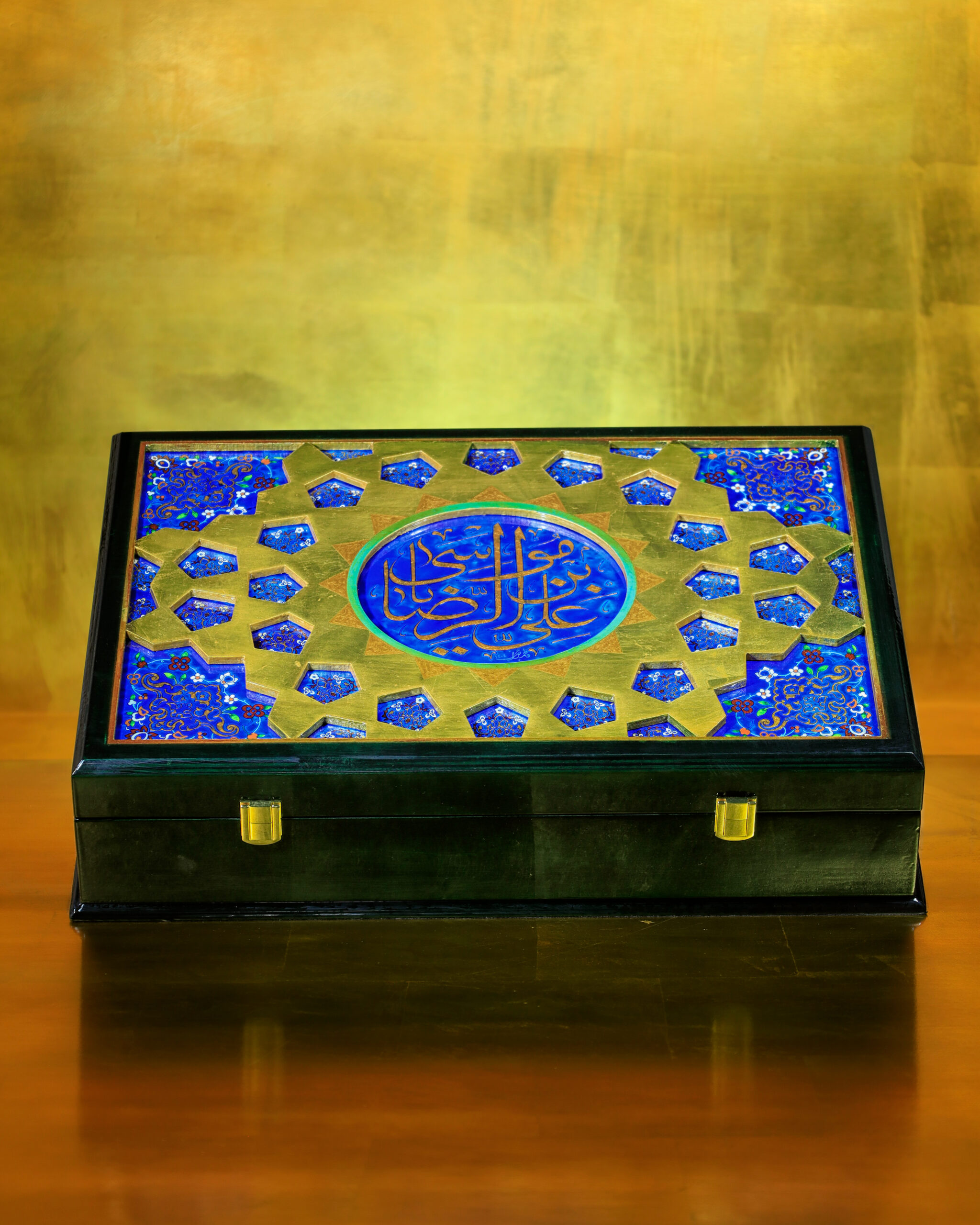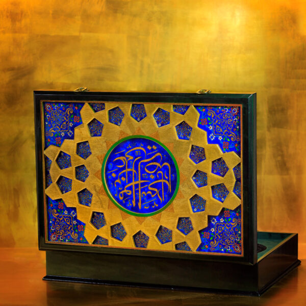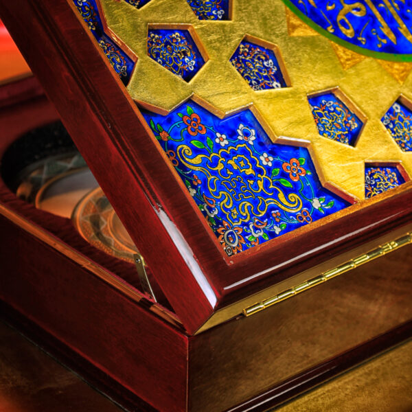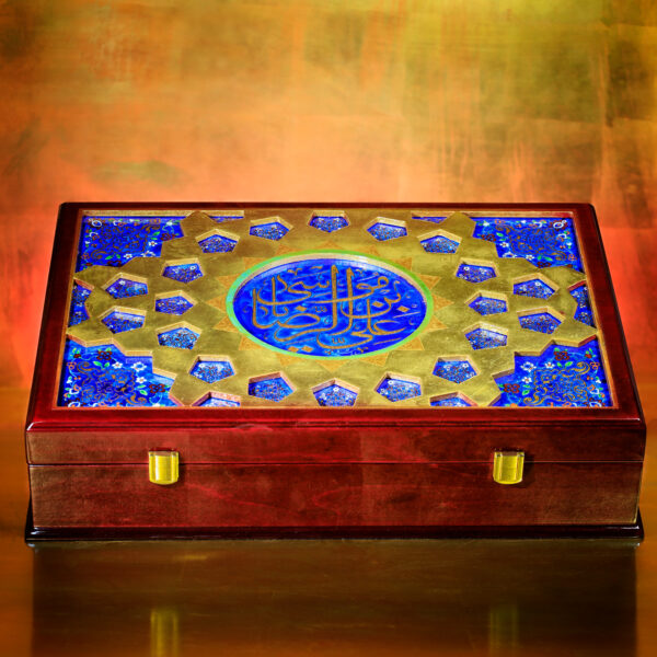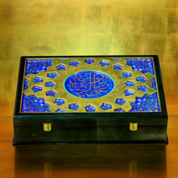 خطوط و تناسباتی که در رواقها دیده میشود، حالا روی جعبه ی نفیس چوبی براق نشستهاند. ترکیب لاجورد و طلایی، یاد همان کاشیهایی است که نور را در حرم میچرخانند و کتیبه «علیبنموسیالرضا» روی سطح، هویت اثر را کامل میکند و ارزش معنوی و وقار اثر را چند برابر میکند...