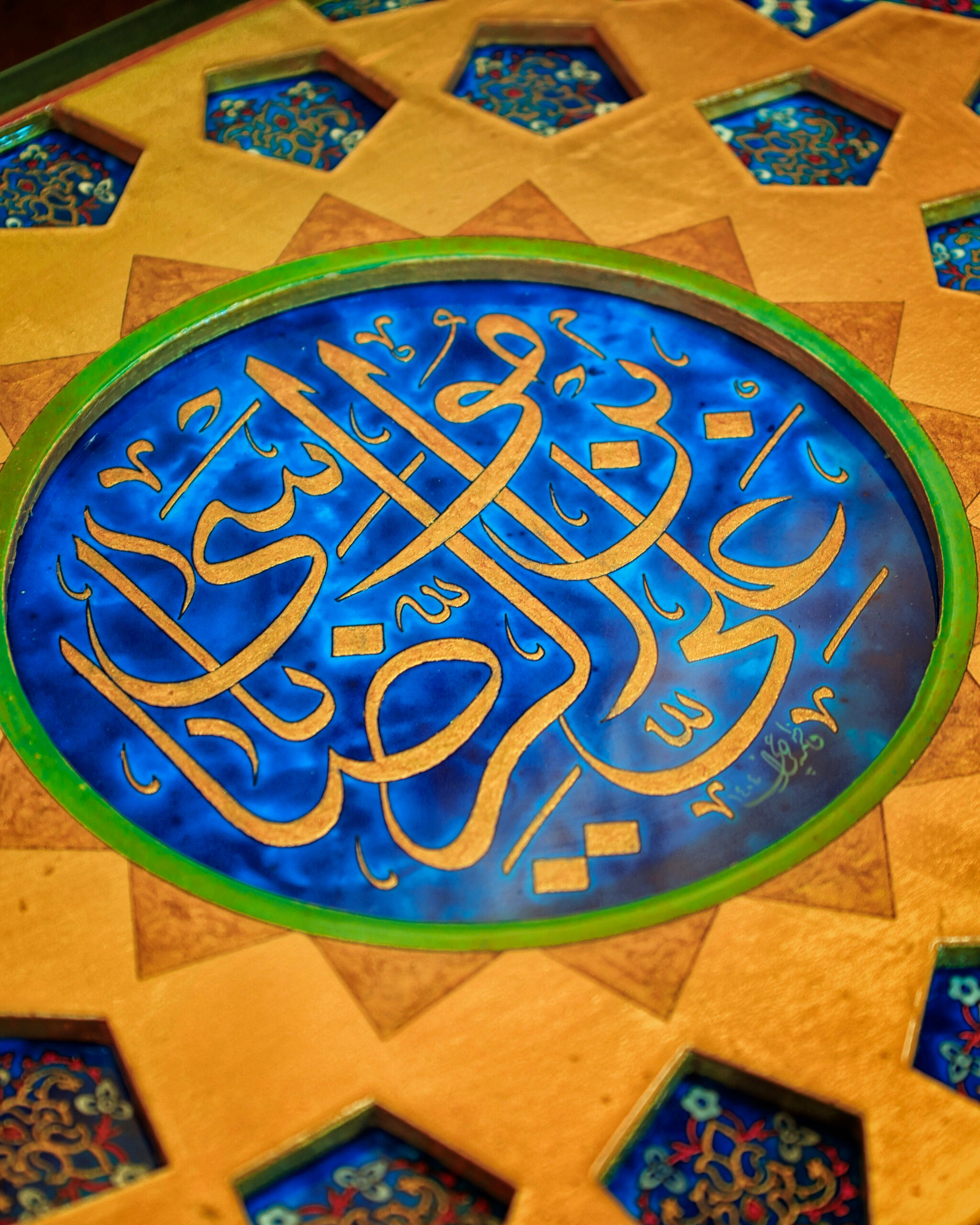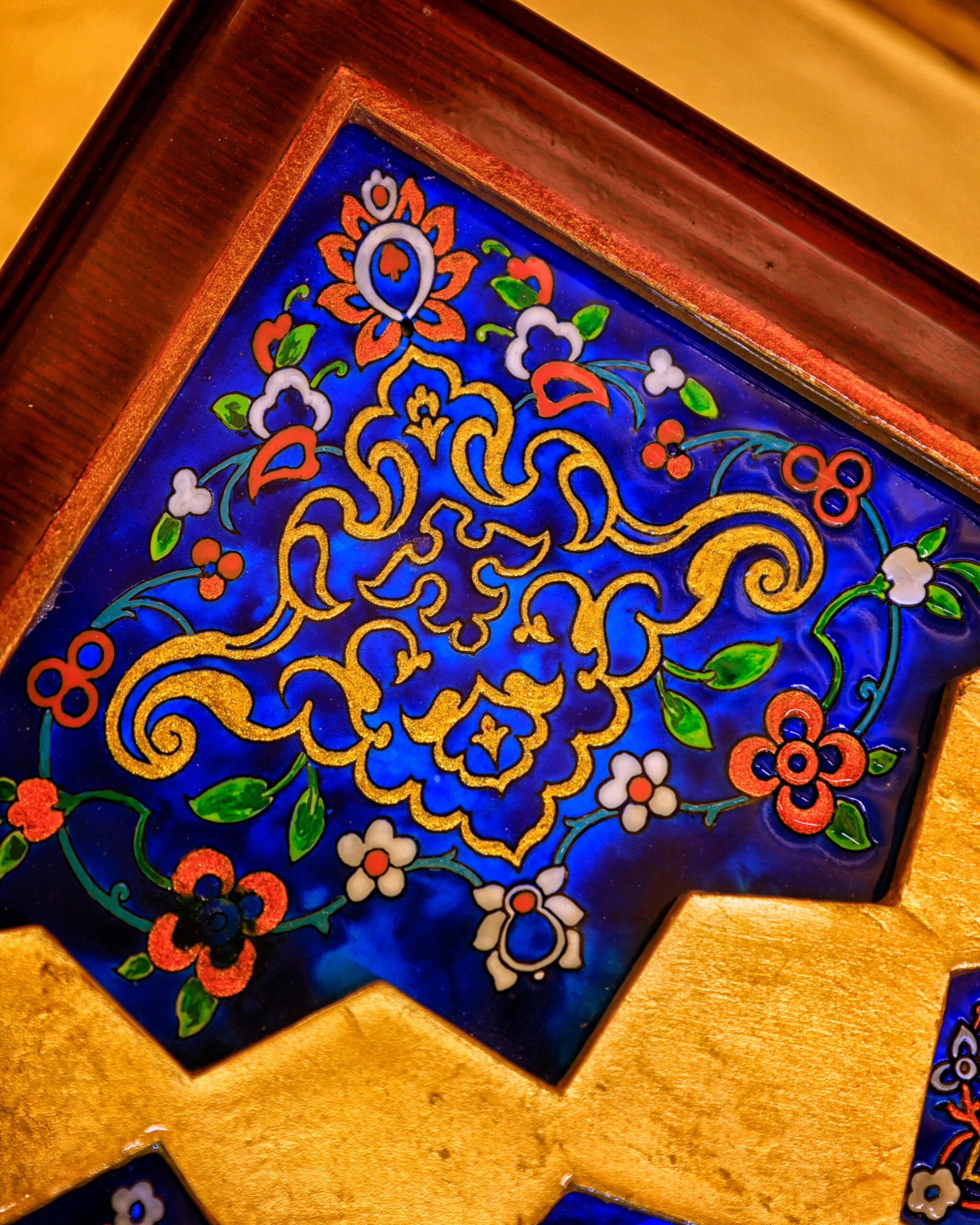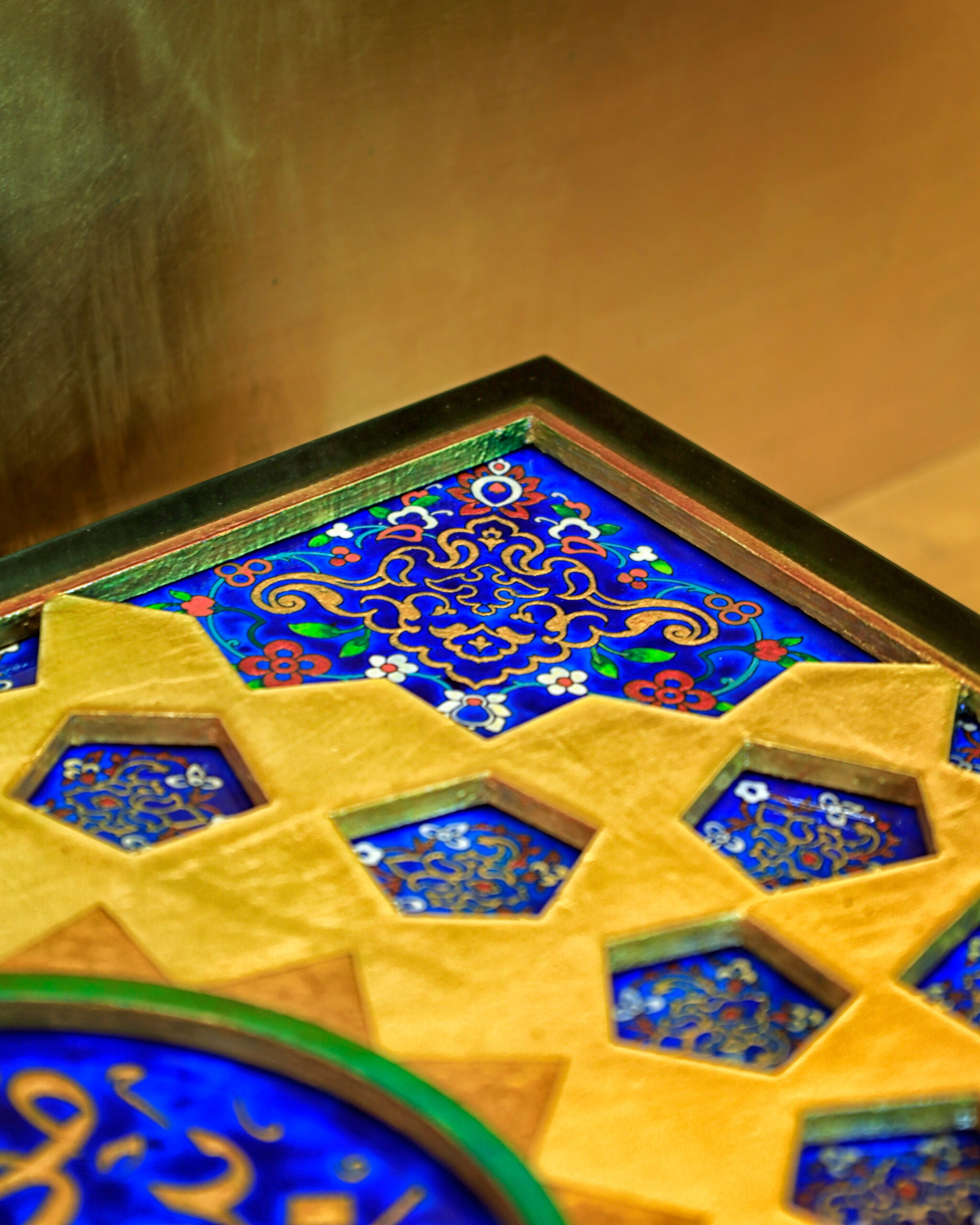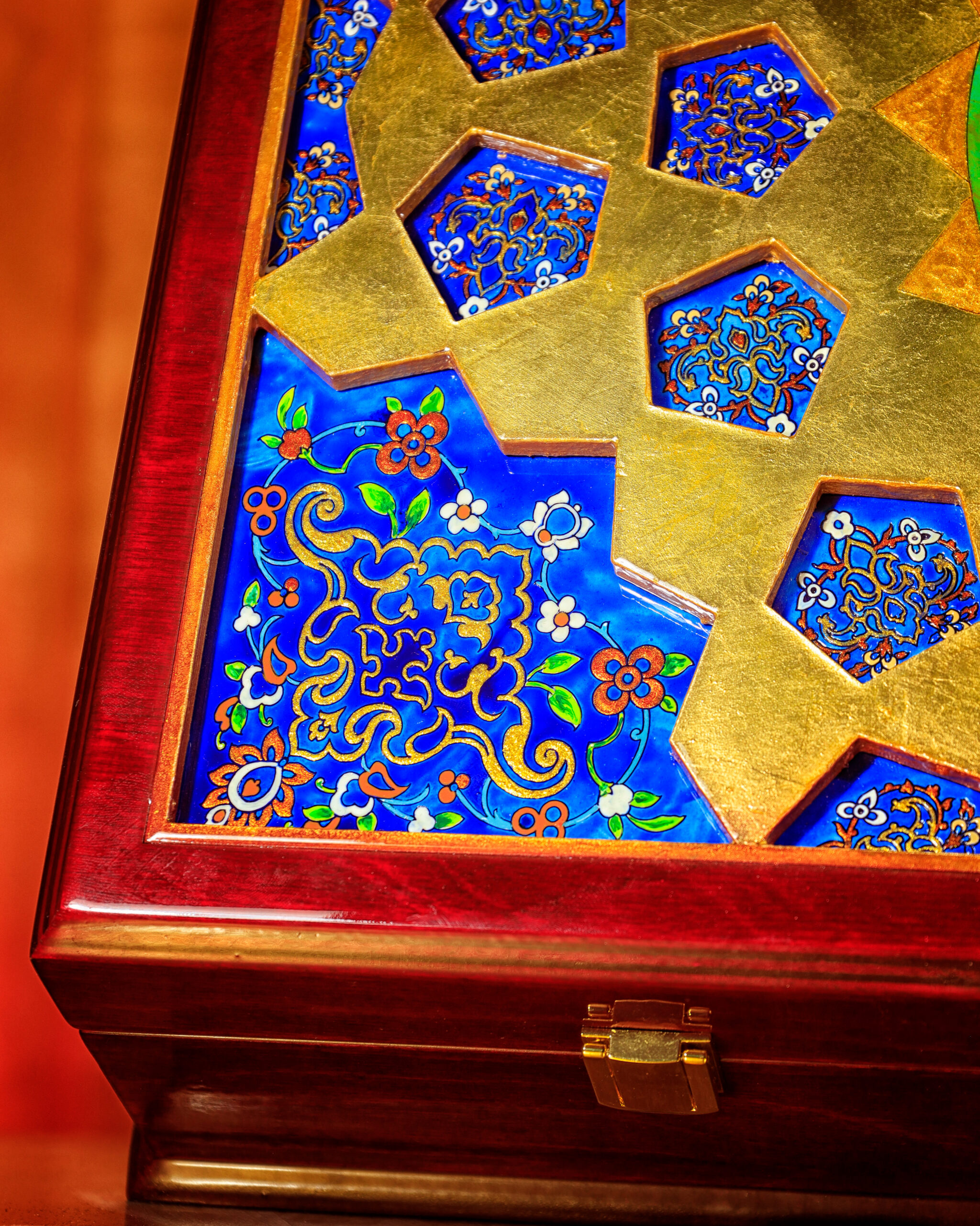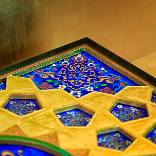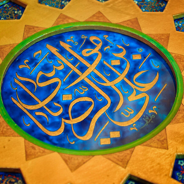خطوط و تناسباتی که در رواقها دیده میشود، حالا روی جعبه ی نفیس چوبی براق نشستهاند. ترکیب لاجورد و طلایی، یاد همان کاشیهایی است که نور را در حرم میچرخانند و کتیبه «علیبنموسیالرضا» روی سطح، هویت اثر را کامل میکند و ارزش معنوی و وقار اثر را چند برابر میکند...